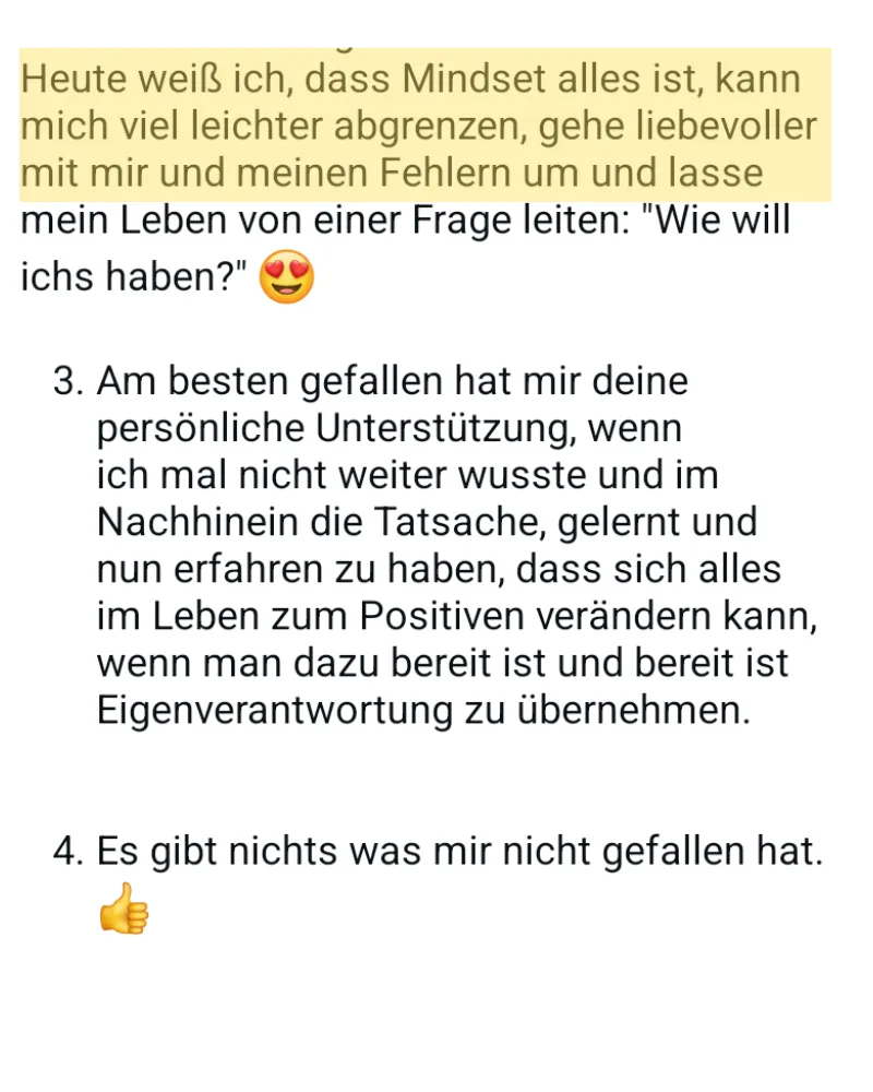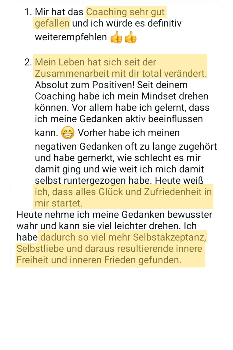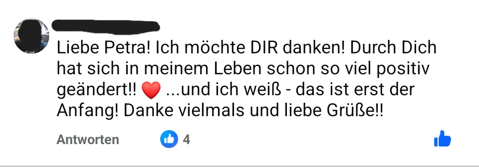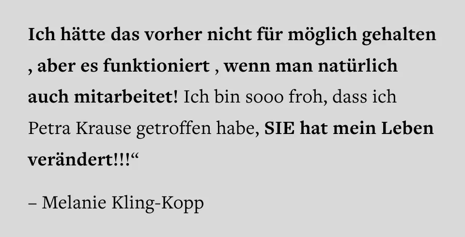 „Ich bin Melanie und hatte plötzlich mit Depressionen, Angstzuständen und Panikattacken zu kämpfen. Ich wollte nicht einfach Tabletten nehmen – ich wollte verstehen, was mit mir los ist. Durch das Coaching mit Petra habe ich gelernt, wieder Vertrauen in mich zu finden. Nach den ersten Sitzungen konnte ich wieder einkaufen gehen, unter Menschen sein und meinen Alltag Schritt für Schritt zurückerobern. Ihr Seminar hat mir zusätzlich Kraft gegeben – nach nur fünf Monaten war ich wieder arbeitsfähig und habe gespürt, wie mein Körper und Geist in Balance kommen. Heute geht es mir so gut wie nie, und das Schönste: Ich bin sogar schwanger geworden – etwas, das vorher wegen Stress nicht möglich war. Petra hat mein Leben verändert. Ich bin unendlich dankbar!“
