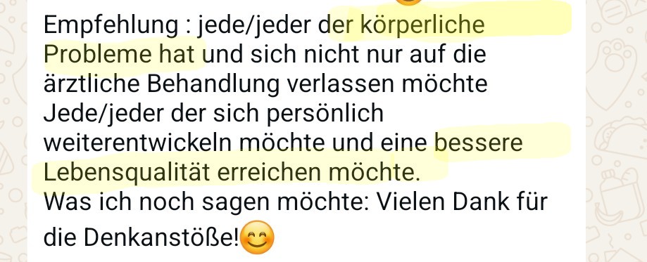 Diese Erkenntnis hat mein Leben verändert und mich auf meinen Weg gebracht, die Zusammenhänge zwischen Körper, Geist und Seele tief zu erforschen.