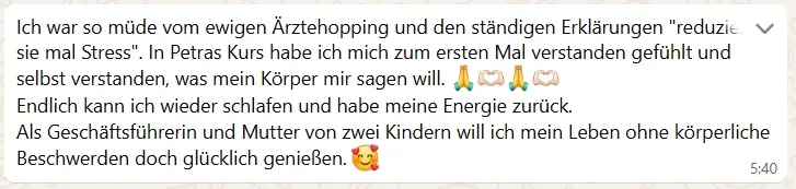 “Ich war so müde vom ewigen Ärztehopping und den ständigen Erklärungen ‘Sie haben wohl Stress’. In Petra`s Webinar habe ich zum ersten Mal wirklich verstanden, was mein Körper mir sagen will - endlich kann ich wieder durchschlafen und habe meine Energie zurück."